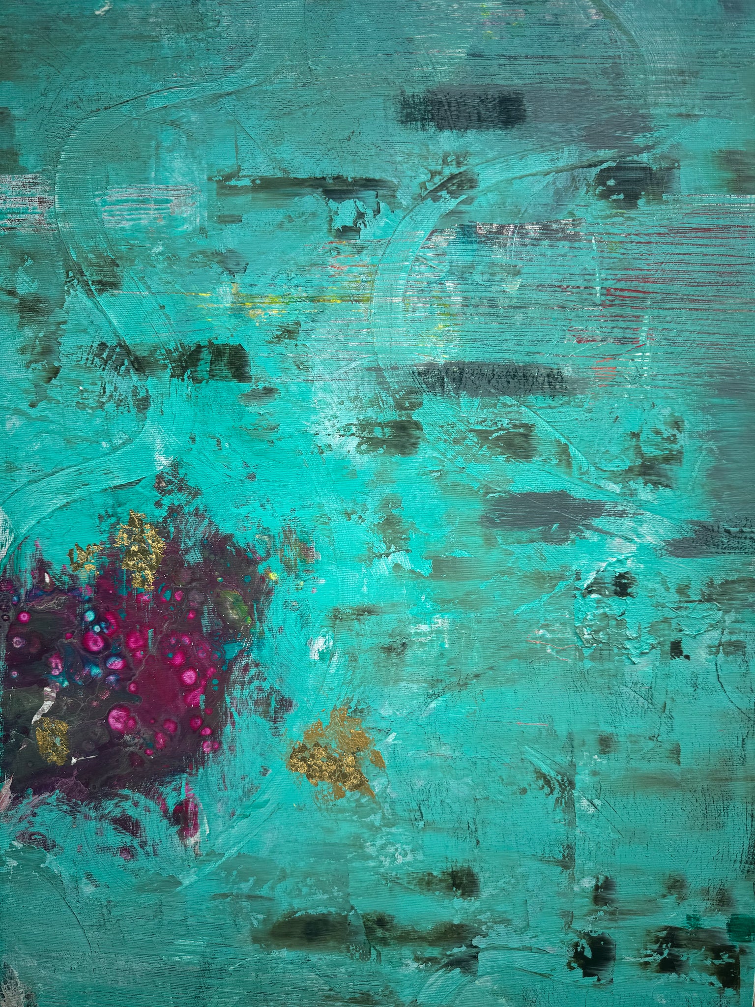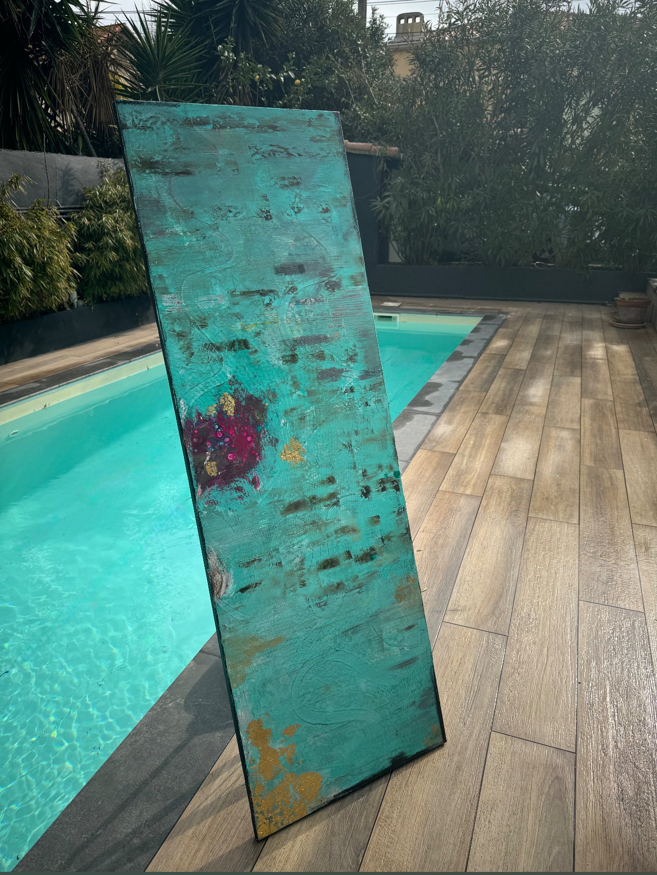 Le titre révèle la dualité du tableau : l’immense bleu-vert du « sans toi », la pulsation pourpre du « avec toi », et l’or, fil d’espérance qui relie et transcende les deux états. Une confession picturale de ce que l’on garde et de ce que l’on est, avant et après l’autre.